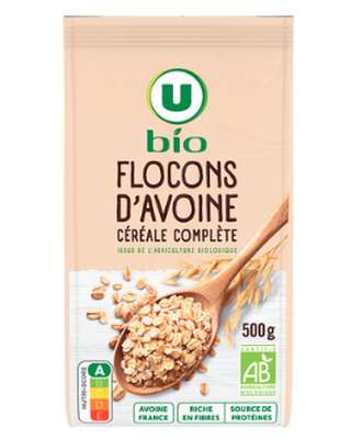 Flocons d'AVOINE complète*. *ingrédient issu de l'agriculture biologique Traces éventuelles de soja, lait et fruits à coque. Origine : avoine France