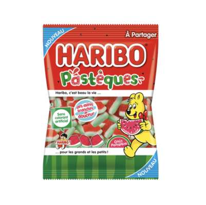 sirop de glucose; sucre; humectant: sirop de sorbitol; eau; gélatine; acidifiant: acide citrique; correcteur d'acidité: citrate trisodique; gélifiant: pectine amidée; arôme; concentrés de fruits et de plantes: radis, patate douce, carotte, carthame, cassis, hibiscus, citron, spiruline. Tenir à l'abri de la chaleur et de l'humidité. Peut contenir des traces de blé, lait.