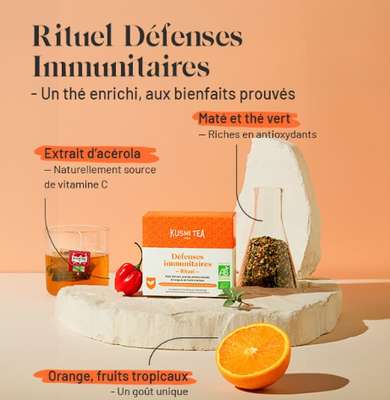 Kusmi Tea innove sans cesse en s’appuyant sur la science avec ce thé santé. Son but ? Stimuler vos défenses immunitaires en savourant chaque jour notre mélange de maté et de thé vert bio aux notes fruitées d’orange, de fruits tropicaux et de cassis. Son secret ? L’acérola, l’un des fruits les plus riches en vitamine C.Parce que certaines périodes sont plus difficiles, nous ne sommes jamais à l'abri d'une petite « baisse de régime » entraînant rhumes et autres infections. Pour allier bien-être et plaisir, nous avons encore innové.